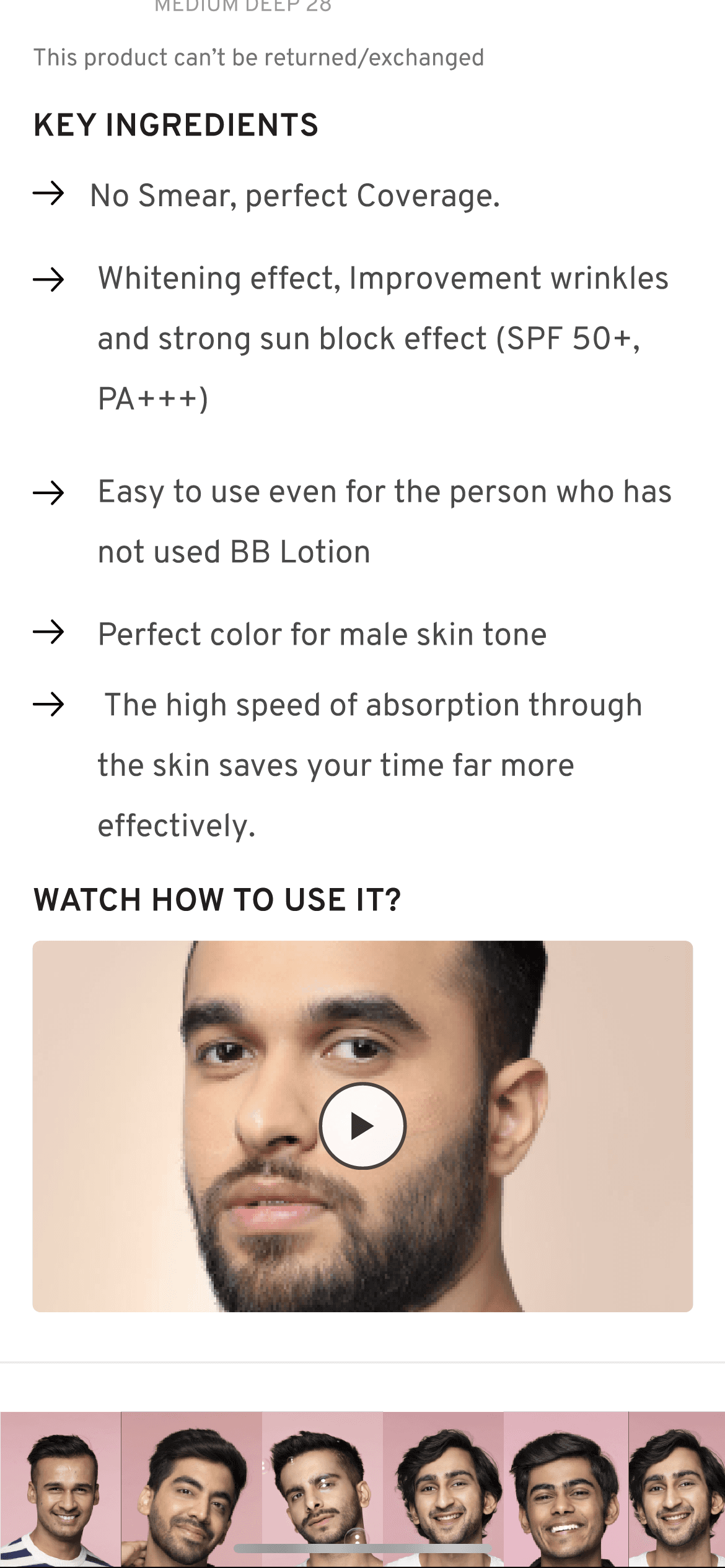 Based on our user interview inputs and competitve analysis we encorported features like Know Your Shade and How to use sections and also a dedicated section showing who needs a BB Cream and See the difference where users can see before and after differences.