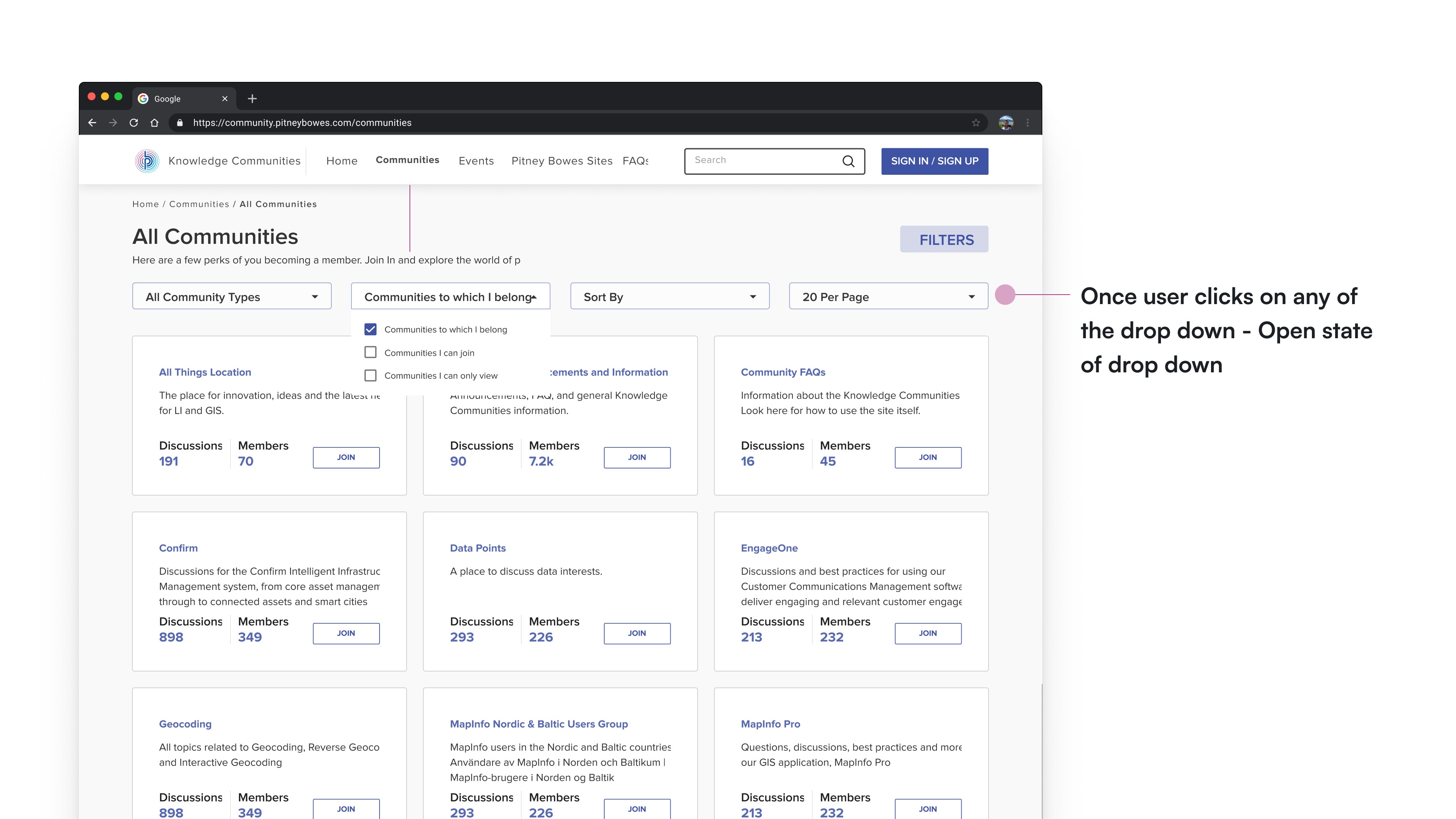 All Communities Page - after clicking Fiters , drop down expanded